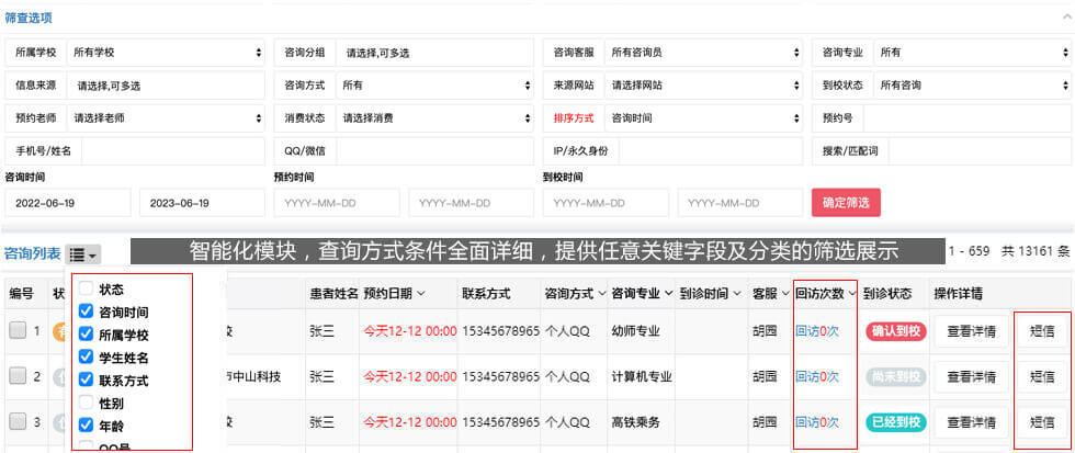 查詢組合條件豐富,界面展現(xiàn)可自定義;針對(duì)競(jìng)價(jià)需要看關(guān)鍵詞,來源渠道;針對(duì)咨詢需要看電話號(hào)碼,預(yù)約時(shí)間;針對(duì)網(wǎng)咨、面咨需要看預(yù)約備注;可自定義展現(xiàn)。